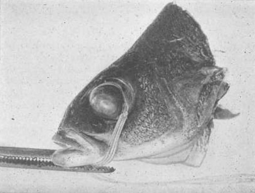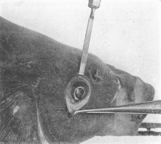 В этом эксперименте на глазу карпа хрусталик был вытеснен со зрительной оси. Аккомодация имеет место после этого смещения точно так же, как и в предыдущих случаях. Заметьте точку на ноже в зрачке на передней поверхности хрусталика.