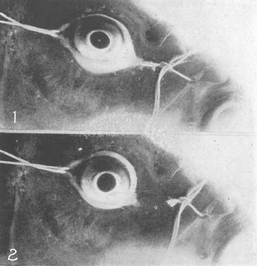 № 1 – Воспроизведение смешанного астигматизма в глазу карпа путем оттягивания нитей, прикрепленных к конъюнктиве, в противоположных направлениях. Заметьте овальную форму передней части глазного яблока.