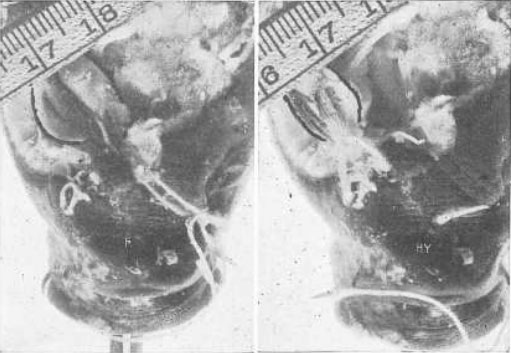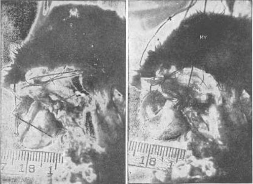 R, состояние покоя. Глазное яблоко имеет нормальную длину и находится в состоянии эмметропии – то есть полностью настроено на зрение вдаль. Му, миопия. Натяжение косых мышц было усилено путем их перемещения, и ретиноскоп показал, что возникла миопия. Легко заметить, что глазное яблоко стало длиннее. Было невозможно избежать какого-либо движения головы между съемкой этих двух кадров, на которых изображены результаты манипуляции с нитями. Но линейка показывает, что фокус камеры не был сильно изменен такими перемещениями.