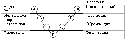 Об этих глобусах Е. П. Блаватская говорит, как о «переходных на четырех нижних планах мира форм»,[202] т. е. в физической и астральной сферах и в двух подразделениях ментальной рупа и арупа. Они могут быть изображены так:[203]
