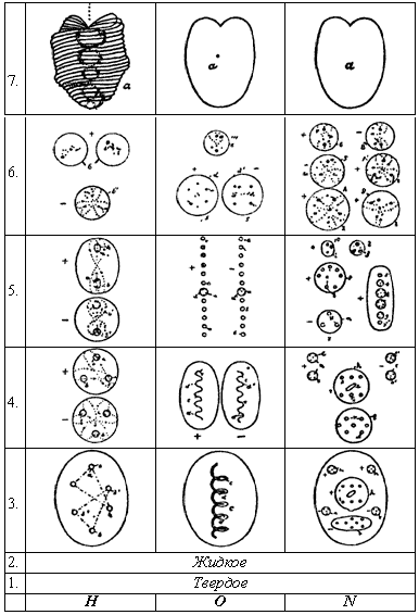 Таблица, показывающая разложение химических элементов: водорода, кислорода и азота, при прохождении их из газообразного состояния через три промежуточные эфирные в четвертое, атомистическое, которое является основным для материи на физическом плане бытия.