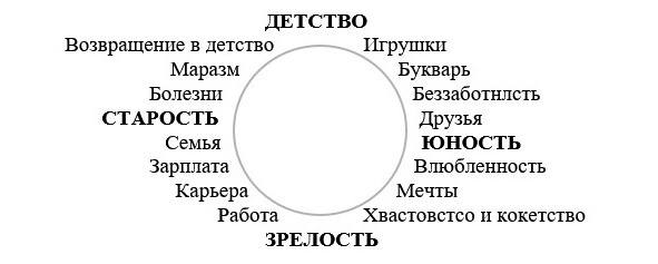 ДЕТСТВО Игрушки. Букварь. Беззаботность. Друзья.ЮНОСТЬ. Влюбленность. Мечты. Хвастовство и кокетство.ЗРЕЛОСТЬ. Работа. Карьера, Зарплата. Семья.СТАРОСТЬ. Болезни. Маразм. Возвращение в детство.