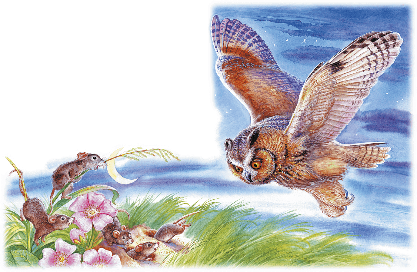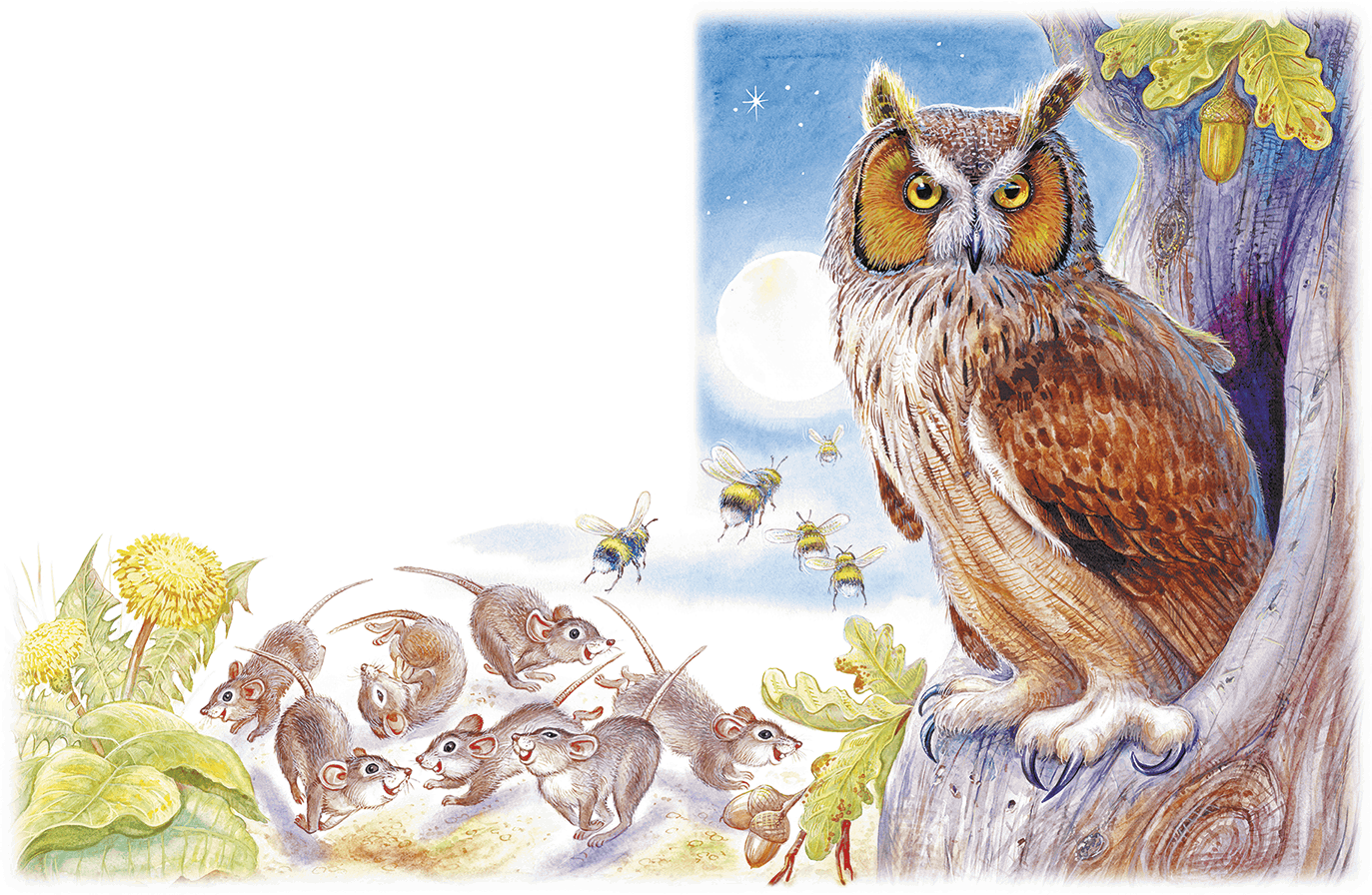 Простила Сова Старика, вылезла из дупла, полетела на луг мышей ловить.