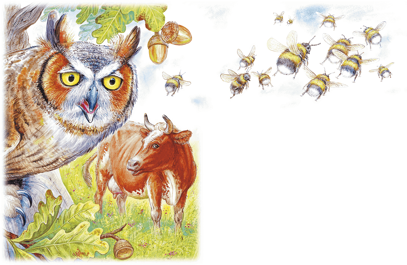 Старик бранится, а дело-то не клеится. Сова в дубу сидит, мышей не ловит. Мыши по лугу рыщут, шмелиные гнёзда ищут. Шмели на чужих лугах гуляют, а на стариков луг и не заглядывают. Клевер на лугу не родится. Корова без клеверу тощает. Молока у коровы мало. Вот и чай белить Старику нечем стало.