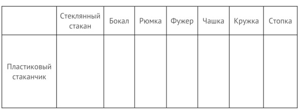Это упражнение является продолжением предыдущего. Теперь вам нужно взять пластиковый стаканчик, граненый стакан, бокал, рюмку, фужер, чашку, кружку, стопку. Опишите каждый предмет, как в предыдущем упражнении.