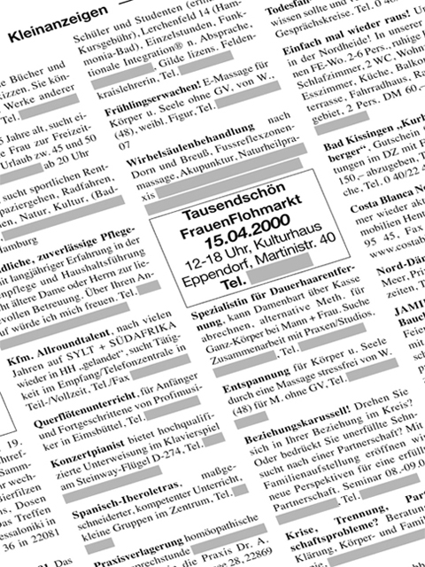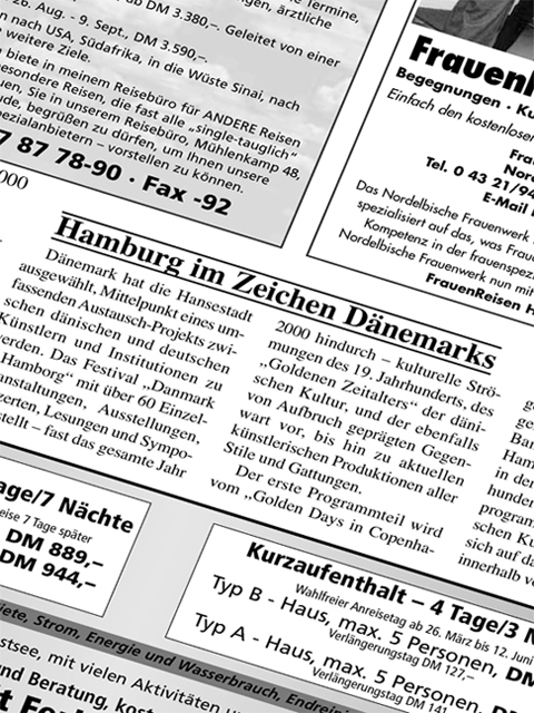 Kleinanzeigenmagazine haben nicht nur reinen Fließtext als Anzeigen, der schnell gesetzt werden muss. Sie enthalten auch mehr oder minder gestaltete Anzeigen, wenn der Kunde zahlt. Aber es kommt so oft vor, dass man als Grafiker und Setzer den Vorgesetzten anspricht und ihn auf falsche Orthografie, falsche Farben oder Fehler in den gelieferten Dokumenten hinweist. Vergebliche Bemühungen! Das Einzige, was als Antwort kommt, ist vermutlich, dass man sich nicht so viele Gedanken über die Anzeige machen soll. Sonst wird das alles zu teuer. Der Kunde hat das so freigegeben, also soll man es so setzen. Ob da Rechtschreibfehler drin sind, ist unwichtig. „Arbeiten Sie zügig weiter!“ Also, Augen zu und durch. Was anderes ist nicht möglich. Sie haben keine Chance, das zu ändern.