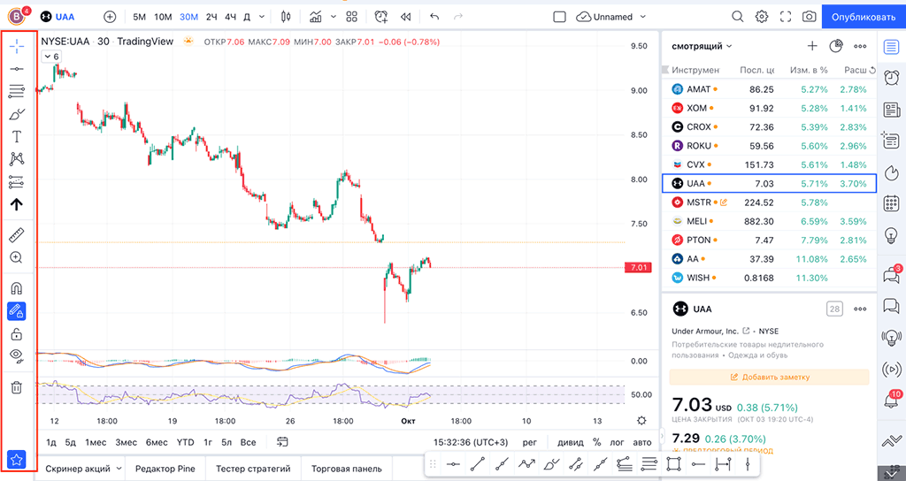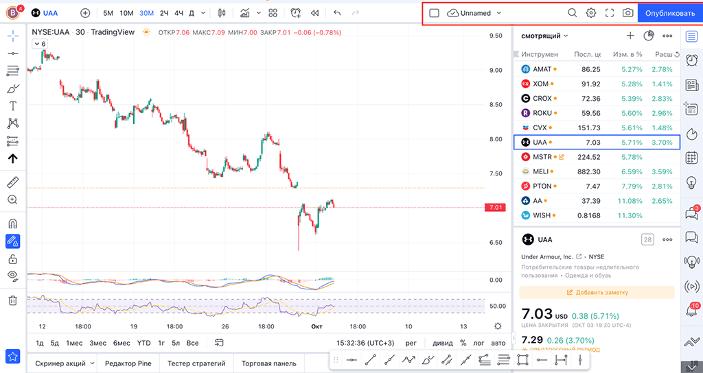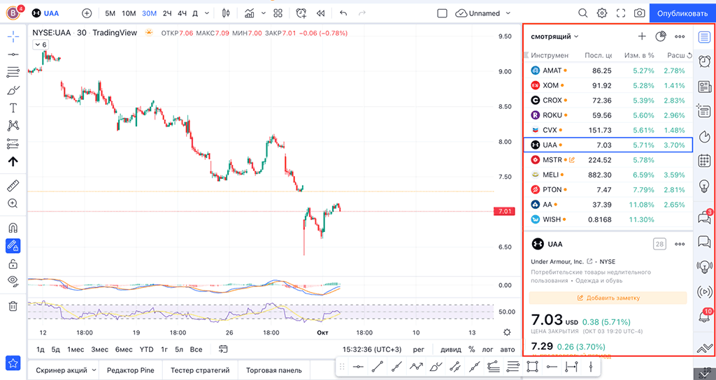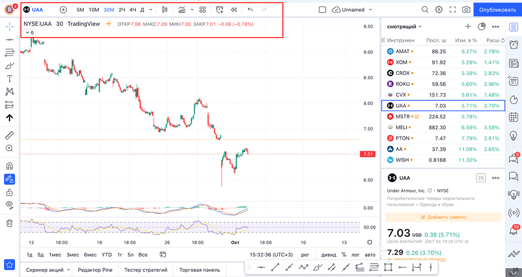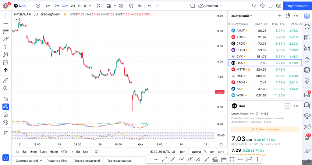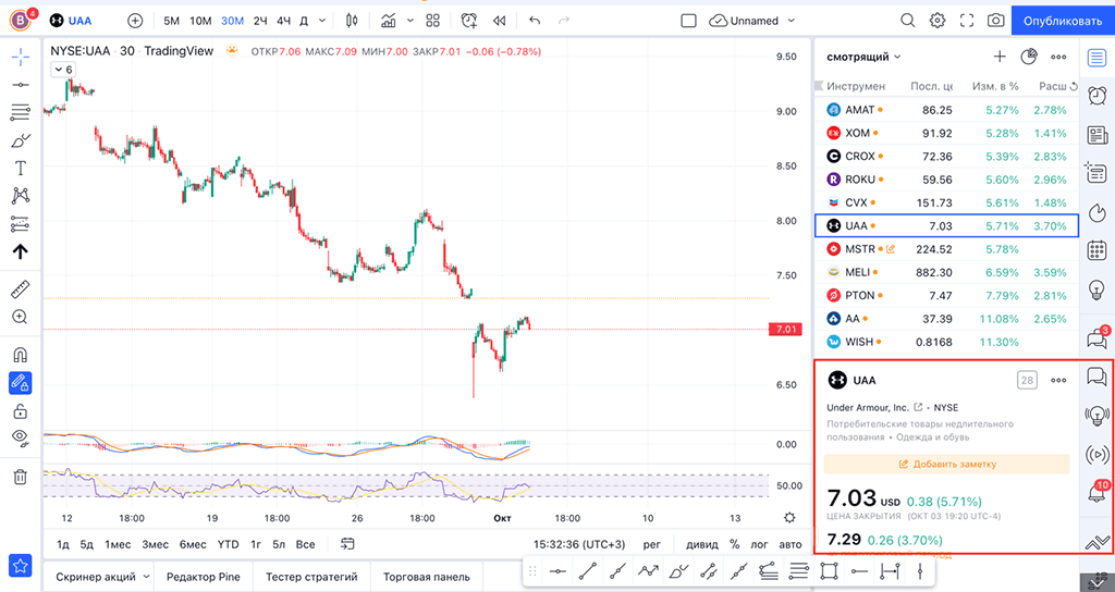 UAA – тикер или название компании, чей график мы видим на экране. Кликните на название, у вас выйдет поиск. Далее вы можете искать по полному названию компании, например, Under Armor, либо по тикеру, в нашем случае UAA.