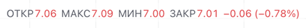 30-минутная свеча открылась по цене 7.06, максимальное значение цены было 7.09, минимальное – 7.00, закрылась по цене 7.02 и изменения цены составило -0.78 %.