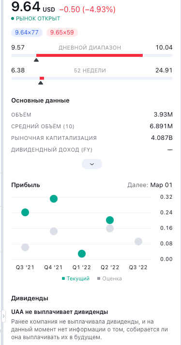 NYSE: UAA – биржа, на которой торгуется актив, и сам тикер.