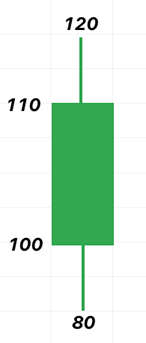 Предположим, что мы работаем на ТФ 10 минут. Следовательно, минимальная цена актива за 10-минутный интервал была 80 рублей, максимальная 120. При этом цена открытия 100 рублей, а закрытия 110.