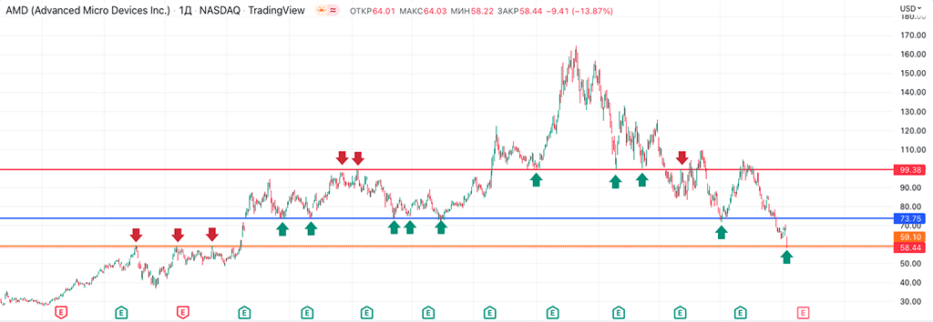 Выше вы видите график AMD, легко заметить уровни на которые реагировала цена.
