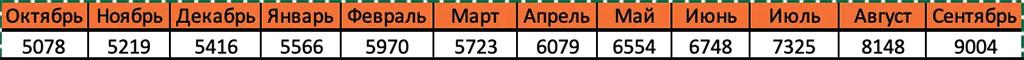 Выше мы видим таблицу, где я взял стоимость FXIT на начало каждого месяца начиная с октября 2019 года и заканчивая сентябрем 2020 года. То есть 1 октября 2019 года мы купили одну штуку за 5078 рублей. 1 ноября 2019 года мы купили эту же акцию за 5219 и т. д. Мы просто в начале каждого месяца на протяжении года покупали по одной акции данного ETF. Таким образом, через год мы суммарно потратили на покупку этих акций 76 830 рублей. Последняя покупка будет совершена нами 1 сентября 2020 года на сумму 9004 рубля.