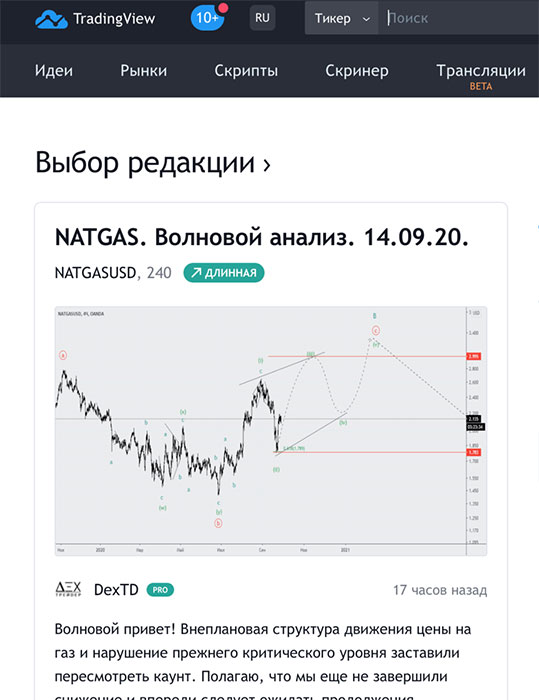 Плюс этого ресурса в том, что в нем не только можно работать с графиками акций, но и ознакомляться с торговыми идеями, публикуемыми на главной странице. Рекомендую основной язык приложения сделать английским, и тогда будет тысяча разных идей от трейдеров со всего мира.