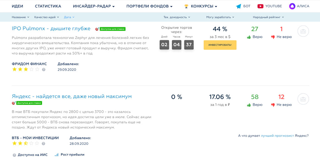Ресурс собирает с рынка идеи по различным финансовым инструментам и размещает про них информацию. При этом на инвестидеи можно заработать не только купив актив, но и внутри сайта выстроена система «доверия».