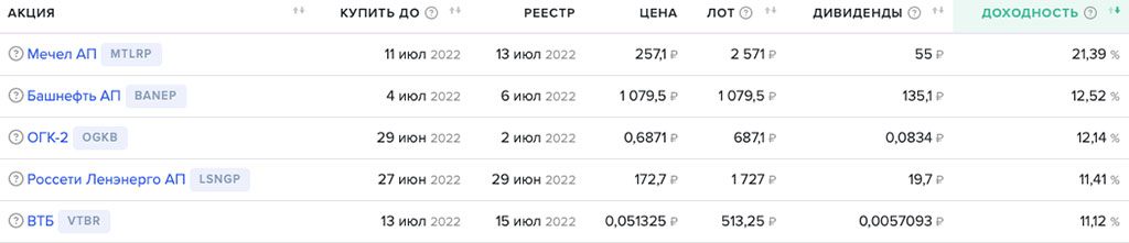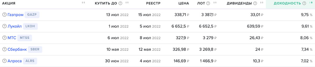 Возьмем топ-5 голубых фишек с максимальными дивами