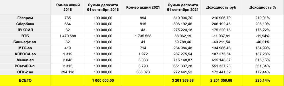Например, если бы вы начали покупать пять лет назад 1 сентября 2016 года все акции и 1 сентября 2021 закрыли все позиции, то получилось бы в итоге по окончании периода.