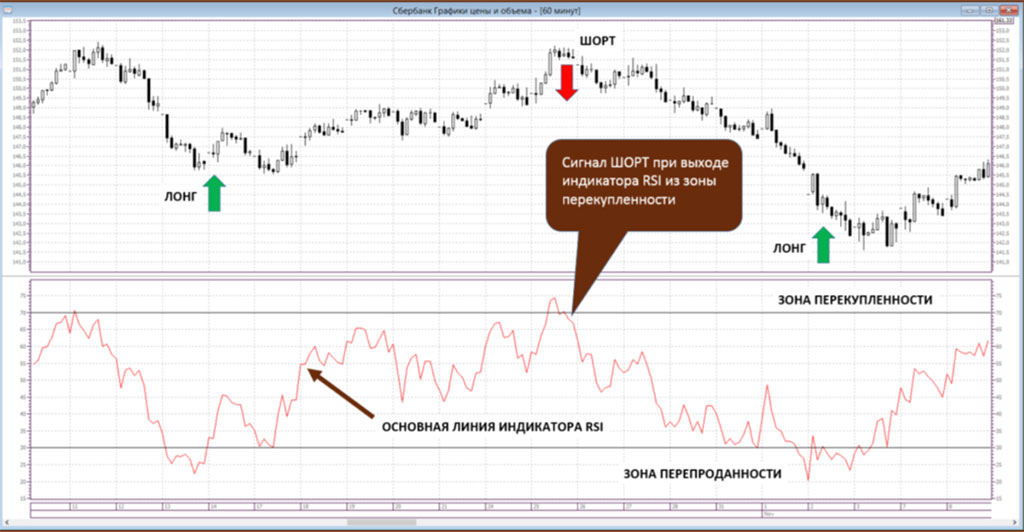 Когда линия достигает значения 70 на шкале – это перекупленность. Когда подходит к значению 30 – перепроданность. Это основные сигналы для входа и выхода.