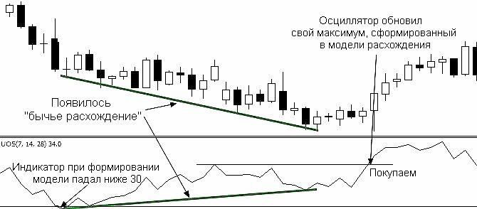 Когда цена на минимуме, а кривая UO стремится вверх – это сигнал о скором окончании нисходящего тренда.