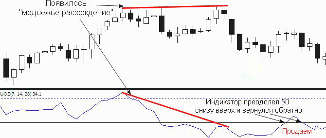 Если есть «медвежье расхождение», дождитесь, когда кривая OU достигнет линии 50 и вернется обратно, как на графике.