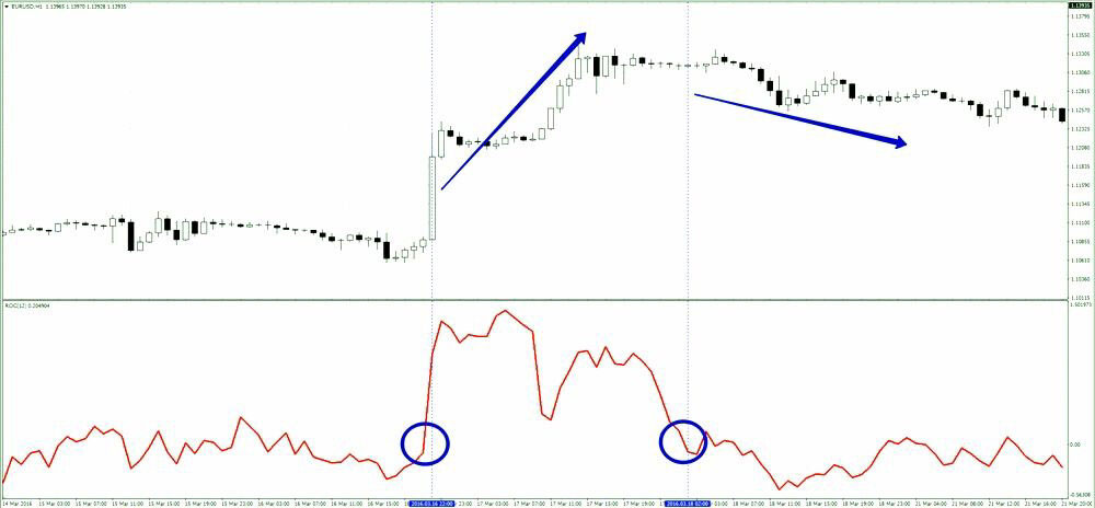 ROC на графикеЧтобы игнорировать ложные сигналы, следите за пересечениями нулевой отметки при выходе кривой индикатора из зоны перепроданности или перекупленности (отмечены на графике). Они сигнализируют о быстром росте или понижении цены.