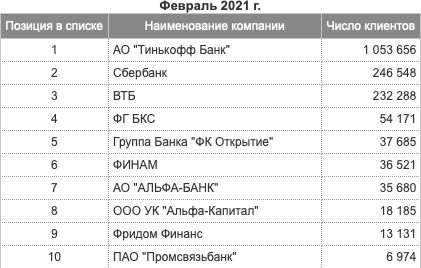 Вот ТОП-10 российских брокеров по числу активных клиентов по версии Мосбиржи.