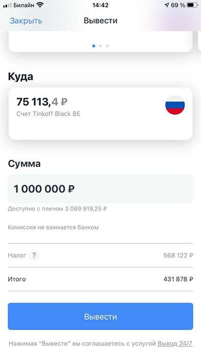 3) либо в приложении нажать на иконку «Вывести деньги» и вбить очень большую сумму, и тогда вы увидите ВСЮ сумму налога, которую с вас должен удержать брокер (это касается тех, у кого «Тинькофф»).