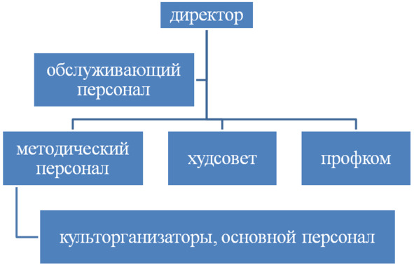 Как видно на схеме, управленческая структура изменена. В ней кроме методического персонала появились еще два демократических института. Они прямо подчинены директору, но в то же время тесно взаимосвязаны друг с другом. Кадровый специалист проводит контрольные мероприятия по работе филиалов согласно графика, по присутствию или отсутствию на рабочем месте. Методист по развитию жанров творчества проводит контрольные мероприятия по соответствию проводимых мероприятий стандартам качества. Методист по работе с внутренней документацией – соответствие количественных показателей филиалов и сводных расчетов учреждения в целом. Методист по работе с основным капиталом периодически сверяет соответствие материально-технической базы, соответствия условий в зданиях для населения необходимым нормам, соответствие коммунальным стандартам. Еженедельный мониторинг работы филиалов анализируется и сотрудникам дается возможность исправить их в течение недели. После этого составляются служебные письма директору и художественному совету для определения необходимости решения по данным проступкам сотрудников на комиссии по трудовым отношениям. Методический персонал