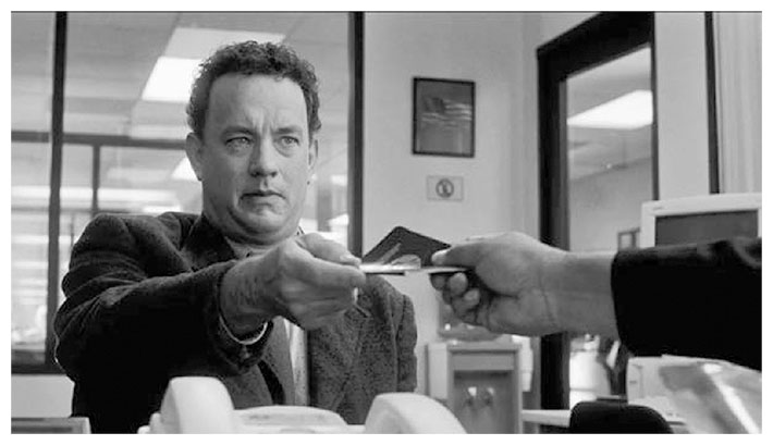 Виктор Наворски (Том Хэнкс) неуверенно передает свой паспорт. Кадр из фильма «Терминал» (2004) (Amblin Entertainment)