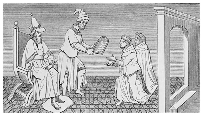 «Великий К{х}ан, передающий золотую скрижаль братьям Поло. С миниатюры XIV века» из книги «Путешествия сира Марко Поло» (1903), переведенной и отредактированной полковником сэром Генри Юлом. (Archive.org)