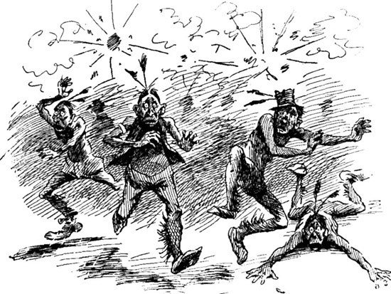 Some four or five thousand Indians joined the Confederates in this battle, but were so astonished at the cannon, and so shocked by the large decayed balls, as they called the shells, which came hurtling through the air, now and then hurting an Indian severely, that they went home before the exercises were more than half through. They were down on the programme for some fantastic and interesting tortures of Union prisoners, but when they got home to the reservation and had picked the briers out of themselves they said that war was about as barbarous a thing as they were ever to, and they went to bed early, leaving a call for 9.30 A.M. on the following day.