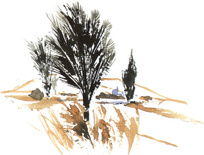 A fingernail scraped through wet watercolour paint made the trunks of these trees.