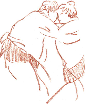 Spend time watching your subject before you draw. See if you can if pinpoint a particular movement you want to catch, then pick up a large sheet of drawing paper and start to draw – fast, as this way you won’t have time to think or become nervous. When the figure changes position, start another drawing. Work on until your sheet is filled with half-finished studies. Eventually a figure will return to the first position you drew, then another, and so on. You should then be able to complete each or most of the studies. Working like this will give you not only practice in capturing movement but also studies of figures that can be used later in a painting.