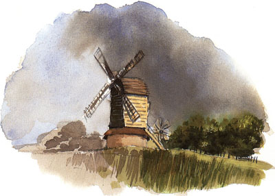 This windmill was painted using a grisaille method. I laid in a tonal ground using sepia ink diluted with water to make a range of tones from near black to white. Watercolour was then glazed over the tones to add colour. The left side of the painting below the sky has been left uncoloured to show the tones used.