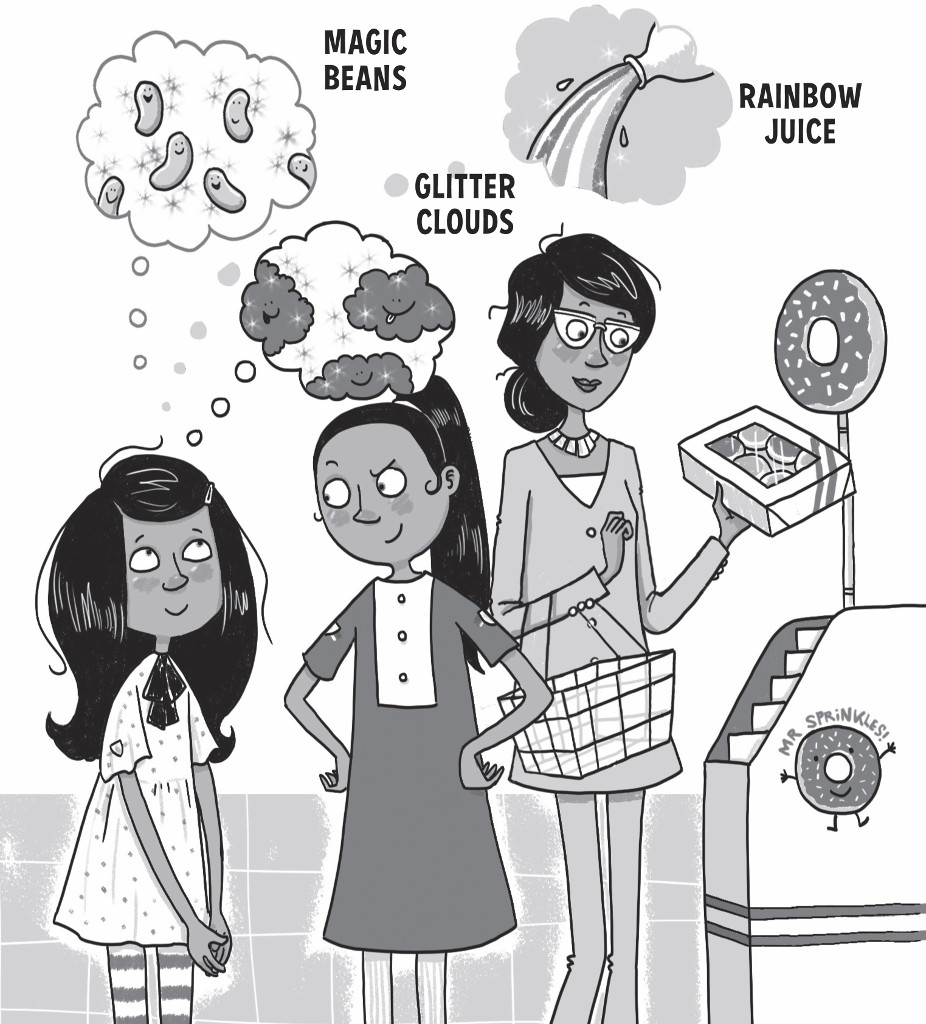 Before heading to the Magic Portal that would take them to Unicorn School, Mira’s mum took them to the supermarket. Mira and Rani needed to get treats for their unicorns and Mum needed to buy doughnuts for someone’s birthday at work.