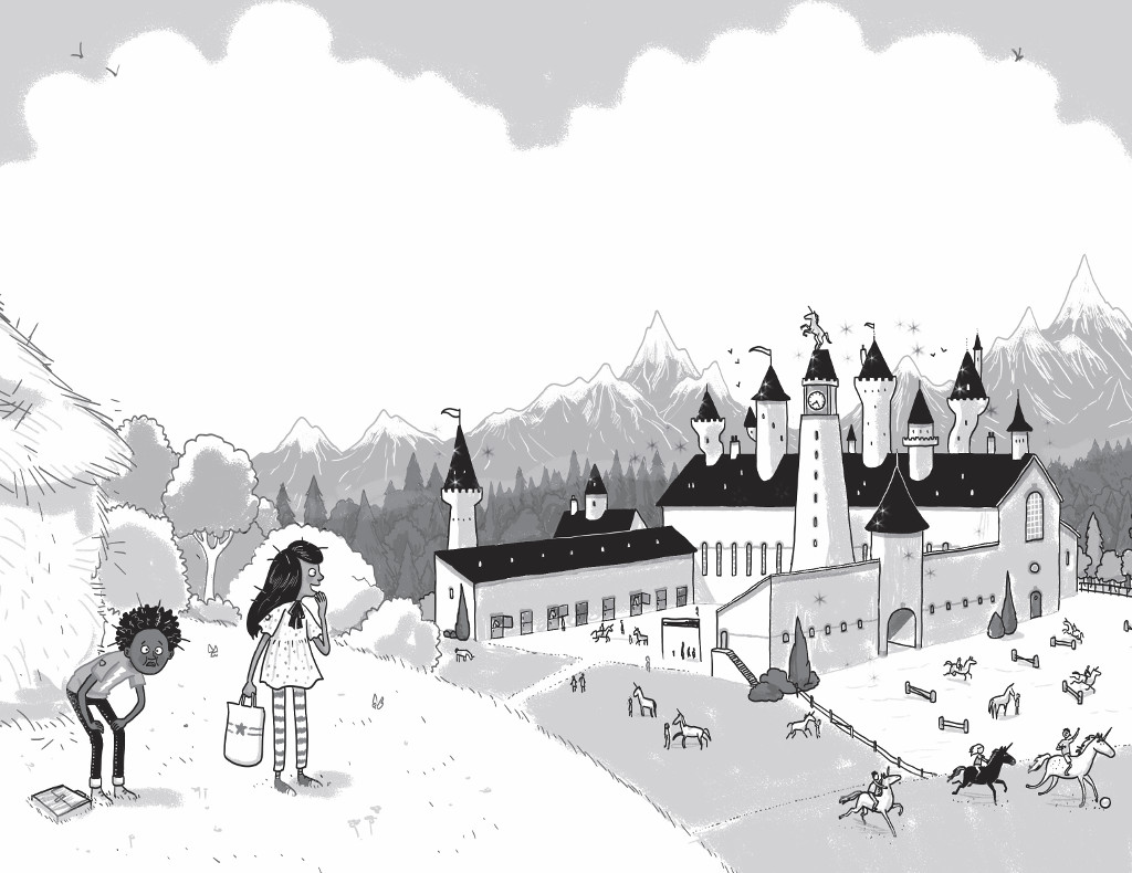 They climbed off the landing haystack, just as the next children were deposited by the rainbow. Mira looked around her and pulled strands of hay out of her hair. In front of them was Unicorn School. It was HUGE. It had turrets and a clocktower and looked a bit like a castle, but lots of it was all on one level, like a bungalow. (Because unicorns don’t like stairs, Mira thought. There was nothing about unicorns that she didn’t know.) Rani had told Mira that the dormitories, where the pupils slept at night-time, were up in the turrets and that the unicorns slept in their stables.