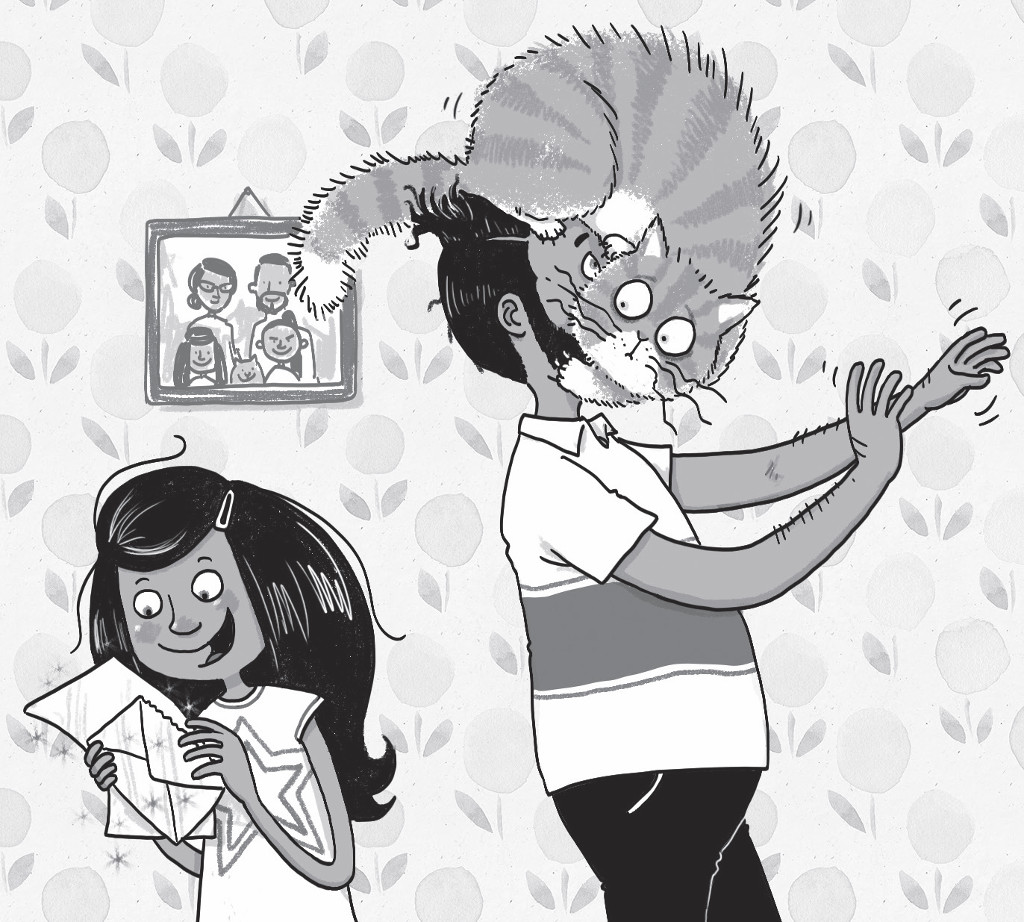 Terrified, Pickles jumped on to Mira’s dad’s face and wouldn’t let go of his beard. ‘Mfmfmfmf !’ he said cheerfully and gave Mira a thumbs up, before leaving the room and walking into the wall.