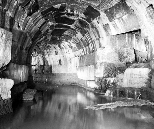 22. Сохранившийся фрагмент подземной Великой клоаки (Cloaca Maxima). Первоначальный вид дренажного канала, скорее всего, не был таким грандиозным, как этот более поздний вариант. Однако именно этот образ представал перед глазами римских писателей при словах о строительных проектах Тарквиния. Некоторым удавалось проехать на лодке по этой подземной реке