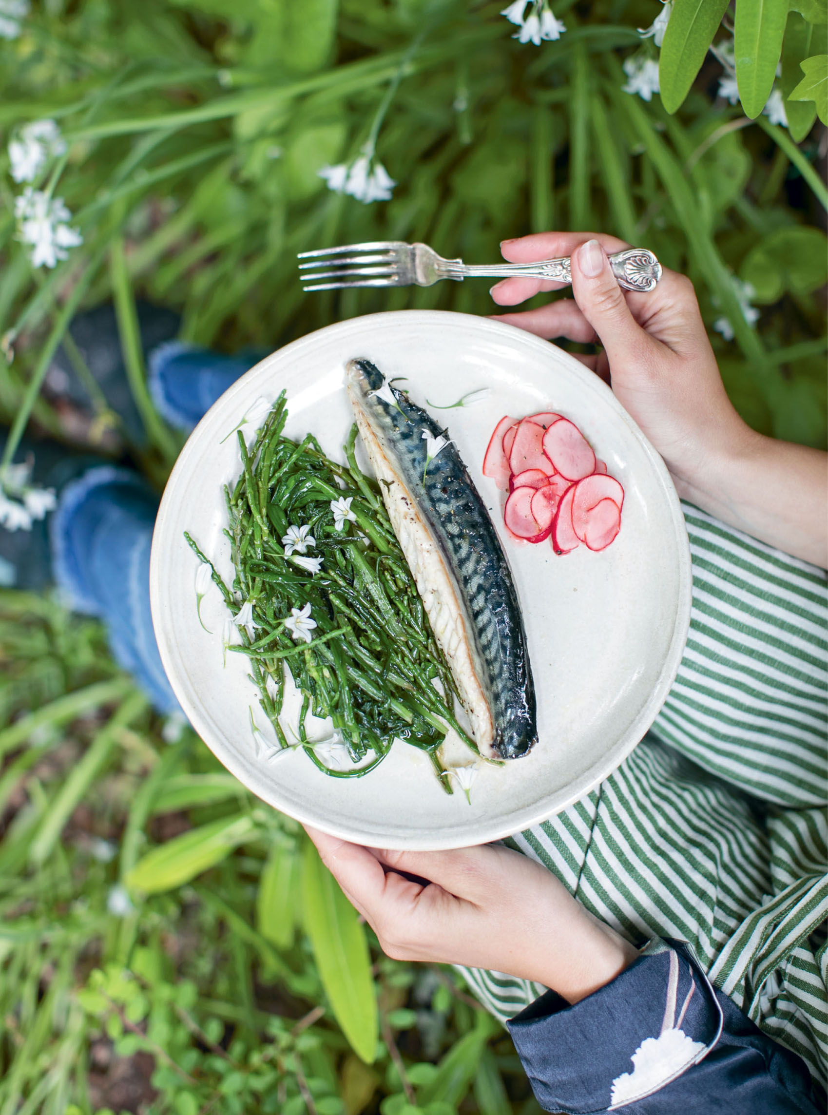 One of my favourite food festivals takes place in May each year on the beach in St Ives, Cornwall. The setting could not be more inspiring – you can smell the sea as you cook. This dish came together one year when I heard about a mackerel honesty box where you could buy the freshest local mackerel for pennies. A kindly local gent was known for having a mackerel ‘shed’ which was always stocked with ready filleted, sparklingly fresh catch just outside his house. I couldn’t resist walking the streets until I found the box. I paired the mackerel fillets with freshly foraged three-cornered leek, which grows like a weed in Cornwall, and is beautiful wilted in butter and served with pan-fried mackerel. If you can’t find wild leeks, use the greens of spring onions or baby leeks, thinly sliced lengthways, with a handful of spinach.