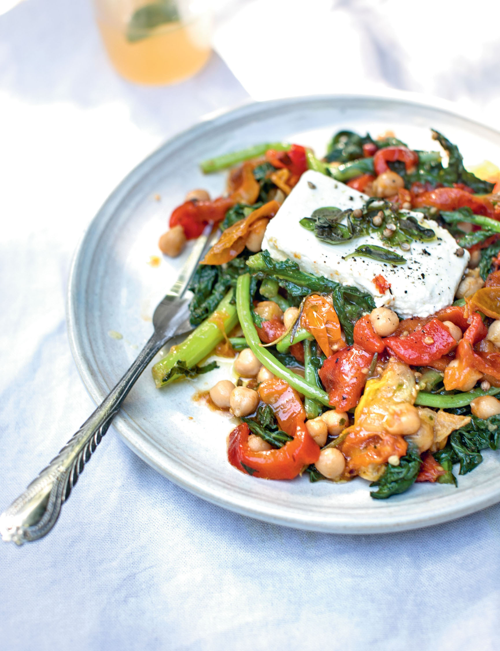 5 Bring a large saucepan of well salted water to the boil. Blanche the cime di rapa stalks in the water for a couple of minutes, then add the leaves, cooking both the leaves and stalks for a further minute, then drain. Remove the tomatoes and chickpeas from the oven, add the red peppers and cime di rapa and toss through. Remove the rosemary sprigs and serve with the baked feta on top and some extra olive oil drizzled over.