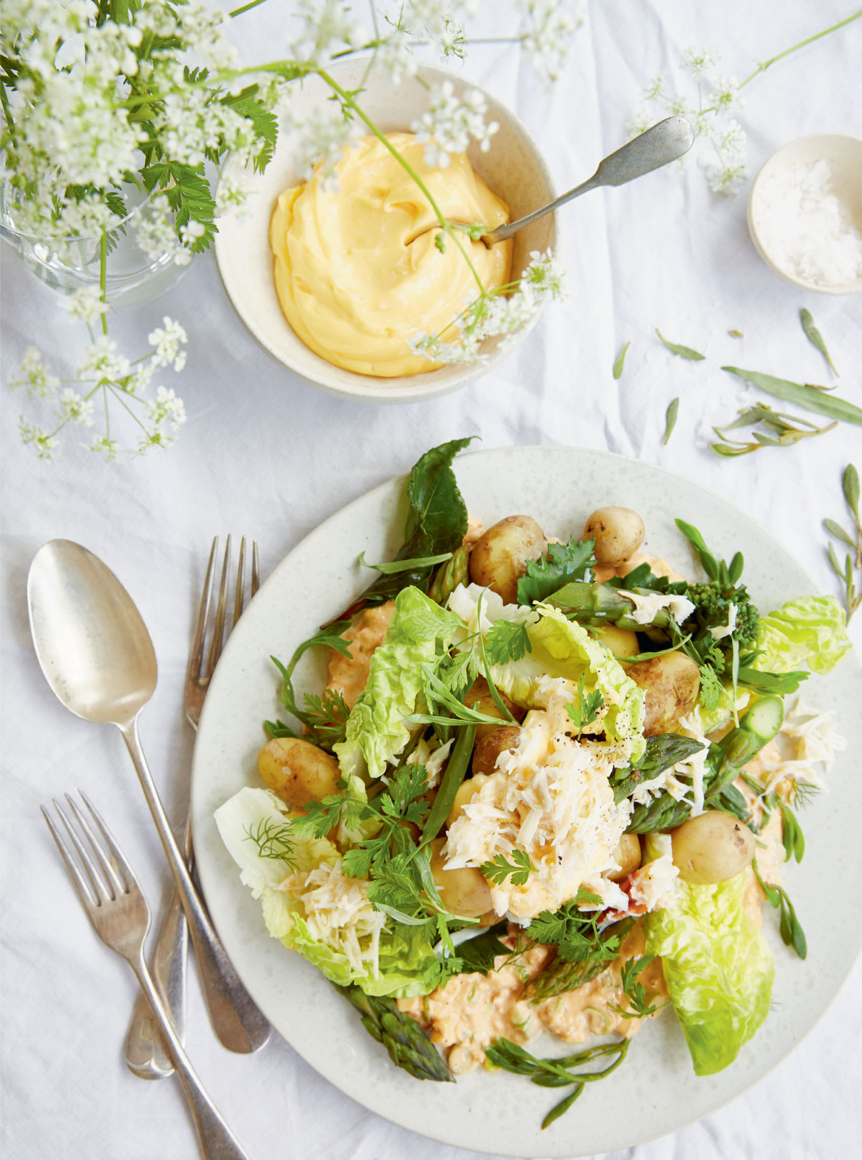 This recipe unites my two favourite spring ingredients – Jersey Royal potatoes and asparagus – with creamy crab, fresh green apple and soft herbs for a celebratory salad. The dish has everything: an irresistible earthy minerality from the potatoes (which are fertilised with seaweed), buttery green goodness from the asparagus, and luxury from the crab and mayo which dresses the salad as you eat it. It’s worth making your own mayonnaise (you can make it in advance, it will keep in the fridge for a few days), but if you’re pressed for time, shop-bought works, too – just stir a good fresh egg yolk through it to enrich it. This is a lunch worth carving out a couple of hours for with a friend.