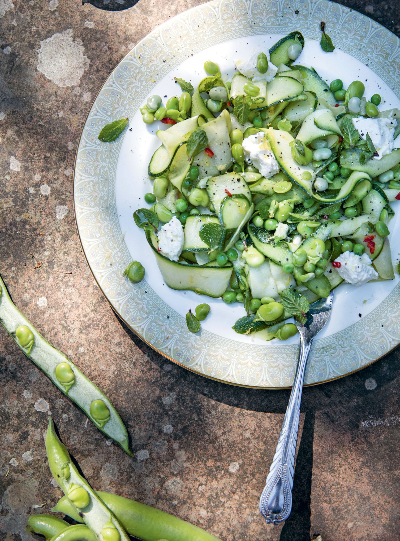 5 Pile the dressed courgettes onto a platter, scatter the broad beans onto the salad and dot over the ricotta or fresh curd cheese. Garnish with the rest of the herbs and serve with any remaining dressing on the side.