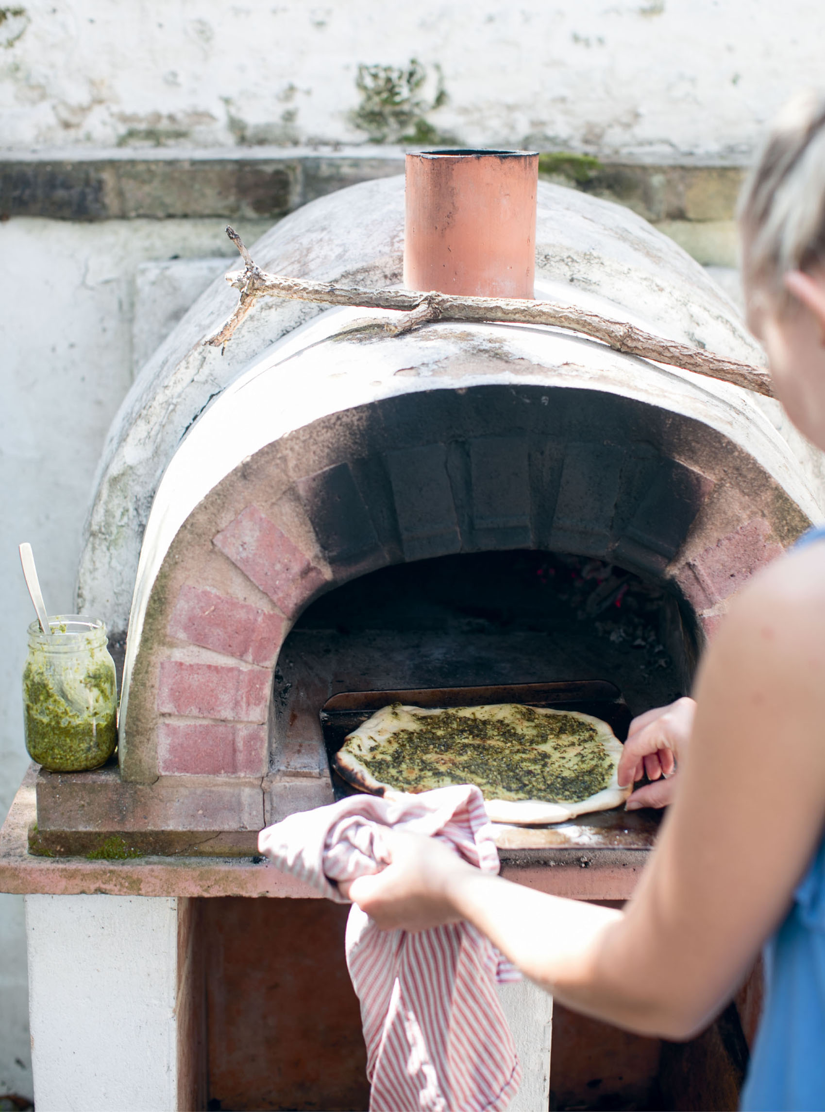 3 If using a griddle pan, place your flatbread on it and cook over the highest heat for 3–5 minutes on each side, until golden and puffed, then remove from the pan and slather the top with the wild garlic pesto (loosened with the tablespoon of oil first) or butter while the bread’s hot. If using the grill, place the flatbreads under the grill and grill for about 4 minutes, until puffed and golden, then brush the tops with the wild garlic butter or pesto and return to the grill for another minute or two. If you’re cooking them in the wood oven, bake them as you would a pizza and brush them afterwards with the pesto or butter. Eat while still warm.