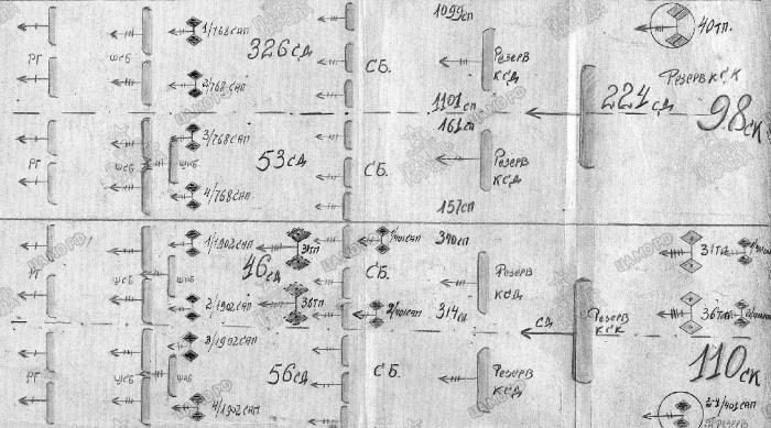 На участке 42-й и 54-й армий возможно отвлекающее наступление. Участок 42-й армии преимущественно занят пулеметно-артиллерийскими батальонами, все ее силы или переданы 67-й армии, или выведены в резерв. Оставшийся корпус (123-й ск), вероятно двухдивизионного состава, предназначен для применения восточней Пскова во взаимодействии с 67-й армией» (11, frame9128023).