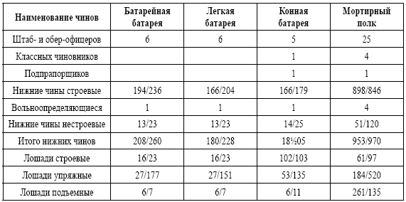 Артиллерия. В Европейской России и на Кавказе артиллерия состояла из: 52 пеших артиллерийских бригад (3 гвардейских, 4 гренадерских, 45 армейских), каждая по 6—9 батарей, образующих 2 или 3 дивизиона; 7 стрелковых дивизионов (6 из трех и 1 из двух батарей), приданных стрелковым бригадам (гвардейской, № 1—5 и Кавказской), 4-батарейного Финляндского артиллерийского полка и 7 мортирных полков (5 по 4 и 2 по 2 батареи). Все батареи имели по 8 орудий, кроме мортирных, имевших по 6 орудий. Конная артиллерия включала 28 конных батарей и 16 казачьих батарей. Конные батареи преимущественно придавались кавалерийским и казачьим дивизиям по 2 каждой. Батареи были сведены в гвардейскую конно-артиллерийскую бригаду 6-батарейного состава, 14 дивизионов, 2-батарейный конно-горный дивизион. 8 батарей оставались отдельными. Все конные батареи имели по 6 орудий, конно-горная – 8 орудий.