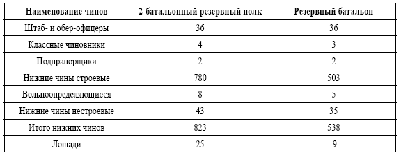 В мирное время пехотные части содержались в сокращенном составе. Резервные пехотные полки и батальоны имели в приграничных округах роты в 64 ряда, во внутренних округах 48 рядов. Некоторые батальоны имели усиленный состав 84 ряда, так 6-й резервный пехотный Сибирский Енисейский батальон насчитывал 36 офицеров и 783 нижних чина.