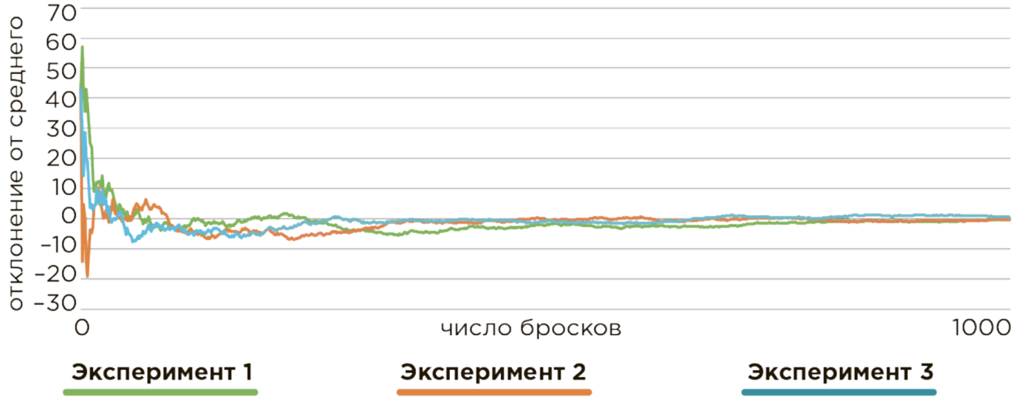 На рисунке 1.5 показан график, демонстрирующий результаты трех независимых экспериментов по подбрасыванию игральных костей. Как видно на графике, отклонения среднего результата могут разительно отличаться при небольшом количестве попыток, но при увеличении их числа результаты выравниваются. Графики построены на основании 1000 бросков в каждом эксперименте. Видно, что они практически смыкаются уже после первых нескольких сотен бросков.