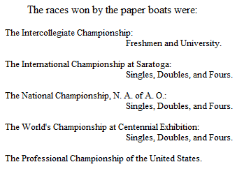 Old and cautious seamen tried to dissuade me from contracting with the Messrs. Waters for the building of a stout paper canoe for my journey. Harvard College had not adopted this "new-fangled notion" at that time, and Cornell had only begun to think of attempting to out-row other colleges at Saratoga by using paper boats. The Centennial year of the independence of the United States, 1876, settled all doubts as to the value of the result of the years of toil of the inventors of the paper boat. During the same year the incendiary completed his revengeful work by burning the paper-boat manufactory at Troy. The loss was a heavy one; but a few weeks later these unflinching men were able to record the following victories achieved that single season by their boats.