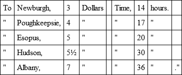 "The North River steamboat will leave Paulus Hook (Jersey City) on Friday, the 4th of September, at 9 in the morning, and arrive at Albany on Saturday at 9 in the afternoon. Provisions, good berths, and accommodations are provided. The charge to each passenger is as follows: