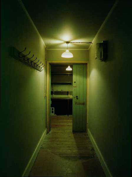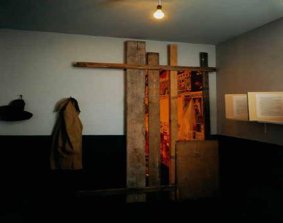 В работе «Человек, улетевший в космос из своей комнаты»4,5 (1985) русский художник Илья Кабаков (род. 1933) выстраивает нарративную сцену, сюжет которой предлагается разгадать зрителю. Мы попадаем в скудно обставленную прихожую, где на одной стене висят плащ и шапка, а на другой – полка с расставленными на ней текстами в рамках. Эти тексты предлагают три отчета об одном инциденте – человеке, улетевшем в космос из своей комнаты, – которые, по всей видимости, были даны милиции тремя соседями беглеца, проживавшими вместе с ним в одной коммунальной квартире. Осмотревшись в прихожей, мы замечаем кое-как заколоченный дверной проем; сквозь щели между досками видна захламленная комнатушка, наполненная плакатами, чертежами и обломками, самодельная катапульта с сиденьем и дыра в потолке. В углу стоит макет городского района, включающий, помимо прочего, тонкую серебряную проволоку, исходящую из крыши одного из домов. Кабаков называет работы такого типа «тотальными инсталляциями», поскольку каждая из них представляет собой иммерсивную среду, в которую попадает зритель: