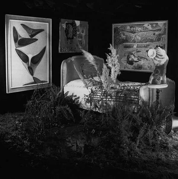 Представленная в Галерее изящных искусств, одном из самых изысканных выставочных залов Парижа, выставка 1938 года решительно трансформировала пышный декор этой престижной площадки, не соответствовавший сюрреалистической эстетике. Жорж Юне рассказывает, как желание замаскировать интерьер галереи моментально стало приоритетным: красные ковры и старинная мебель были вынесены, а яркий дневной свет (проникавший в залы через застекленную крышу) затемнен свисавшими с потолка 1200 грязными мешками из-под угля, набитыми газетами для придания им объема. По полу были раскиданы сухие листья и кусочки пробки, а в каждом из четырех углов стояло по кровати в стиле Людовика XV со смятыми простынями. Возле одной кровати находился бассейн (устроенный Сальвадором Дали), наполненный водяными лилиями и окруженный тростником, мхом, розовыми кустами и папоротником. Центральное помещение выставки напрямую обращалось к ощущениям зрителя: поэт Бенжамен Пере установил здесь машину для обжарки кофе, которая наполняла всю комнату чудесным ароматом, в то время как тревожная аудиозапись истерических голосов пациентов психиатрической больницы разносилась по галерее и, как сообщает Ман Рей, «отбивала у посетителей всякое желание смеяться и шутить»6. Единственным чистым и опрятным пространством на выставке была площадка вокруг установленной в центре жаровни, а сами работы занимали вращающиеся двери, пьедесталы и те участки стен, которые оставались свободными по краям этой онейрической среды.